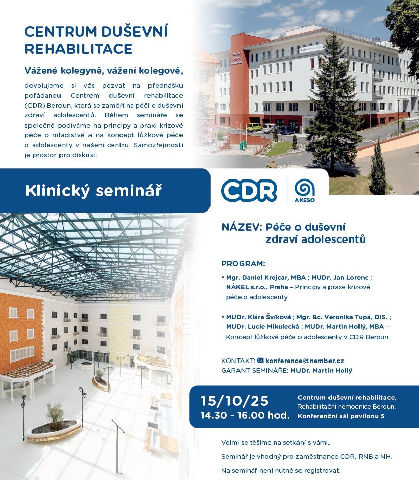 dovolujeme si vás pozvat na přednášku pořádanou Centrem duševní rehabilitace (CDR) Beroun, která se zaměří na péči o duševní zdraví adolescentů. Během semináře se společně podíváme na principy a praxi krizové péče o mladistvé a na koncept lůžkové péče o adolescenty v našem centru. Samozřejmostí je prostor pro diskusi.